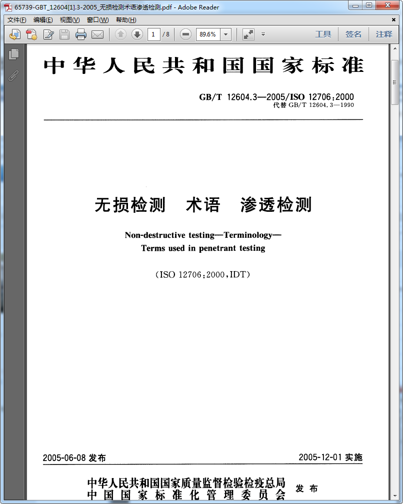 [GB/T 12604.3-2005]无损检测 术语 渗透检测